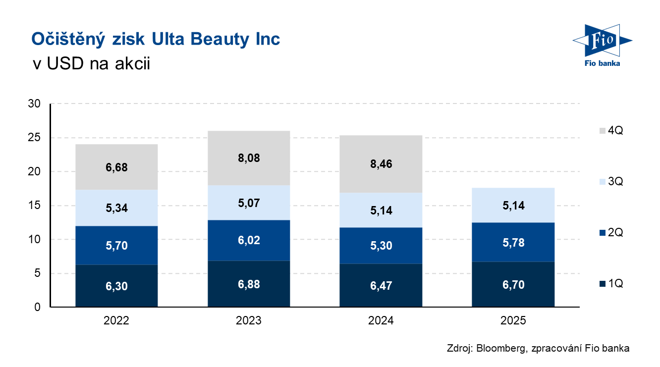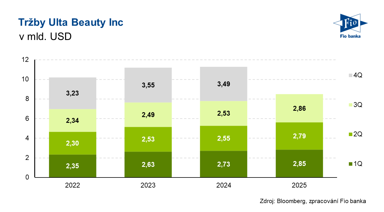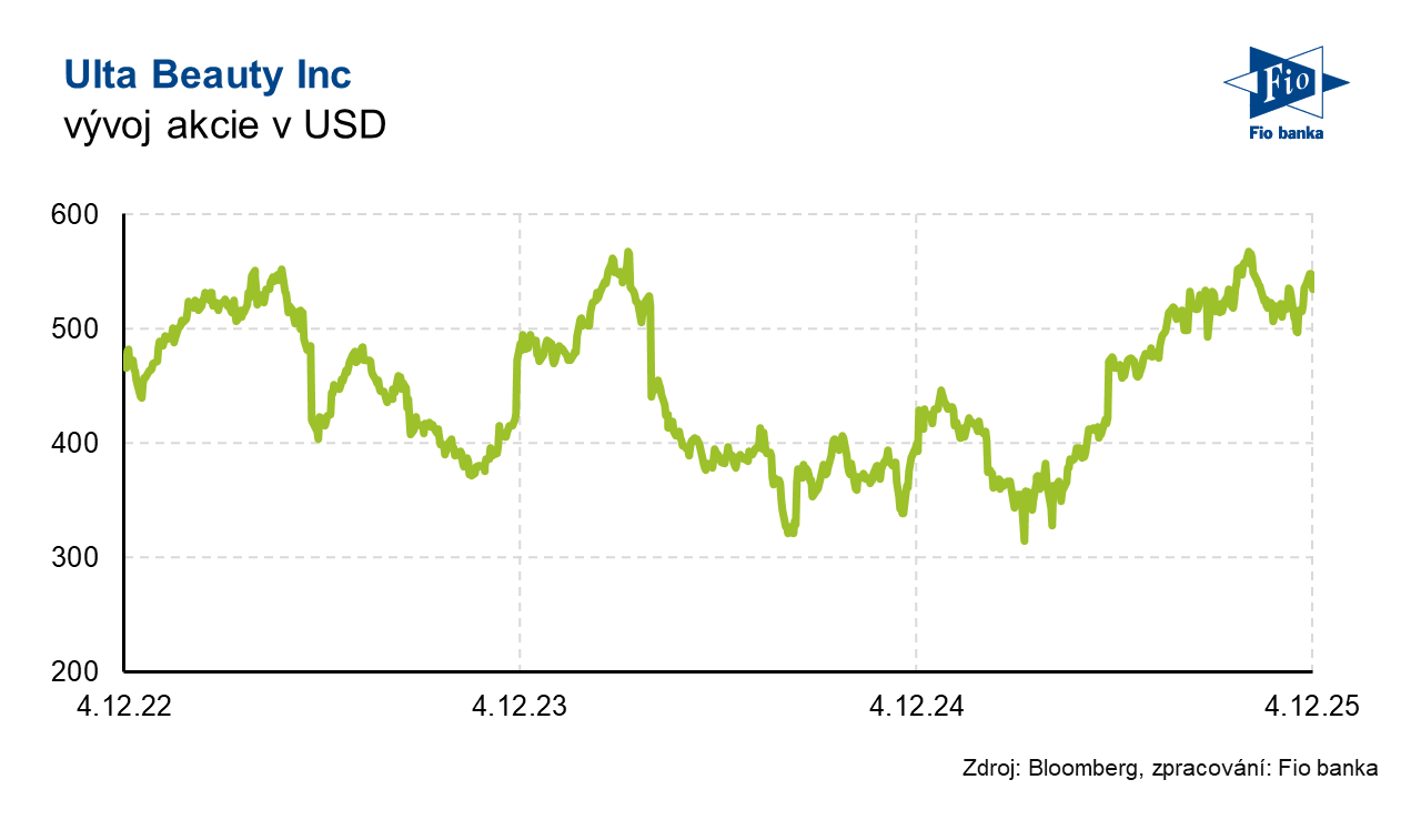 Americký řetězec prodejen kosmetiky Ulta Beauty oznámil včera po uzavření trhu výsledky hospodaření za třetí kvartál fiskálního roku 2025, který skončil 1. listopadu. Tržby i očištěný zisk na akcii byly nad průměrným analytickým odhadem. Srovnatelné tržby pak vzrostly o 6,3 %, tedy výrazně více než trh očekával (+3,41 %). Společnost zároveň zvýšila celoroční výhled.
