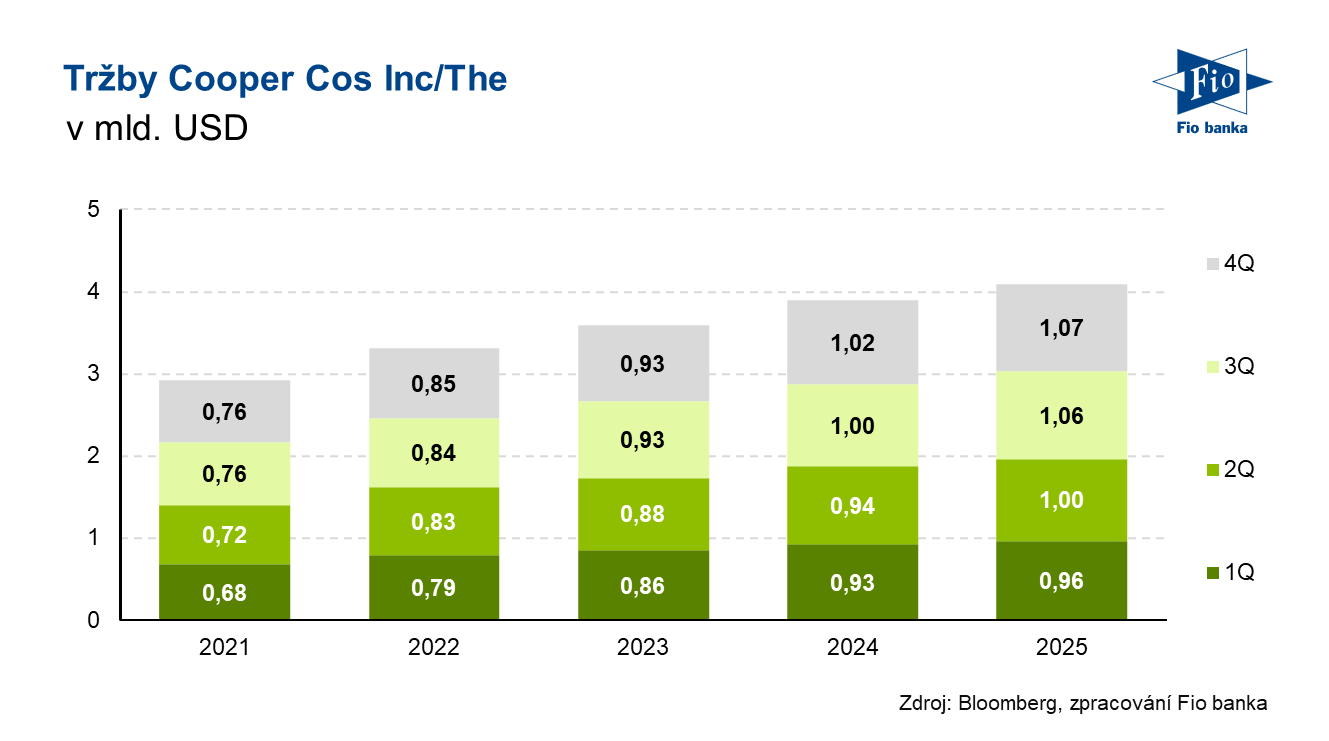 - Segment CooperVision zabývající se výrobou kontaktních čoček měl na tržbách majoritní podíl ve výši 709,6 mil. USD (+5 % meziročně) a mírně překonal odhady na úrovni 706,8 mil. USD.
