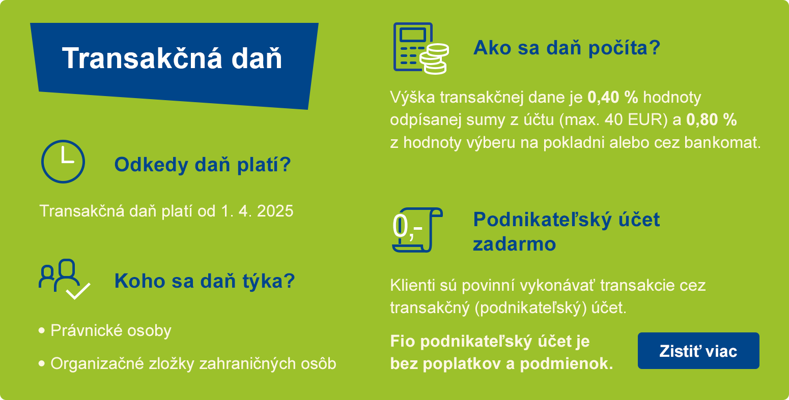 Dňa 1.1.2025 nadobudol účinnosť zákon č. 279/2024 Z. z. o dani z finančných transakcií a o zmene a doplnení niektorých zákonov (ďalej aj len „zákon“), ktorý stanovil Fio banke, a.s., pobočke zahraničnej banky (ďalej len „Fio banka“) povinnosť za určitú skupinu klientov zrážať a odvádzať daň z finančných transakcií.