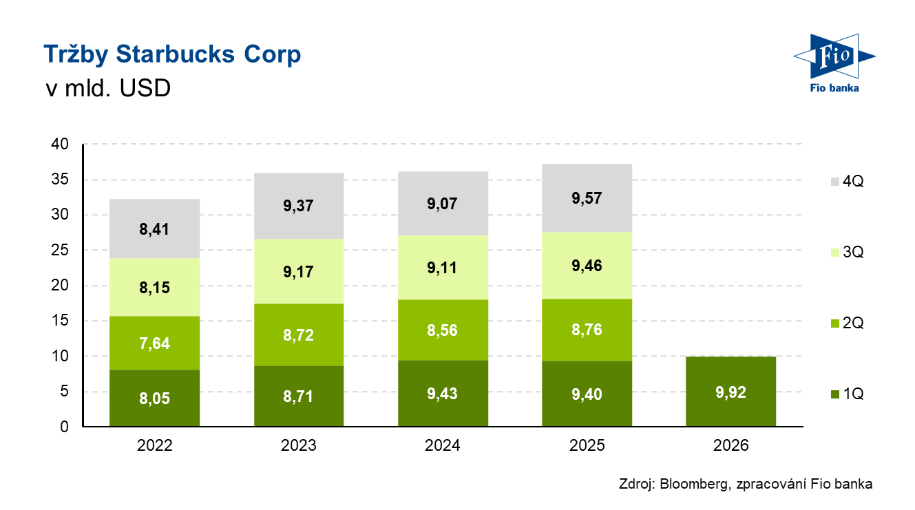 Americká kavárenská společnost Starbucks reportovala výsledky za 1Q fiskálního roku 2026, který skončil 28. prosince 2025. Čisté tržby společnosti v prvním kvartále vzrostly meziročně o 5,5 % na 9,92 mld. USD, čímž překonala očekávání Wall Street ve výši 9,65 mld. USD. Porovnatelné tržby vzrostly o 4 %, což se umístilo rovněž nad odhady trhu. Čistý přírůstek nových poboček v 1. čtvrtletí dosáhl 128. Pro celý následující fiskální rok 2026 Starbucks projektuje nárůst porovnatelných tržeb minimálně o 3 % meziročně a čistý přírůstek nových poboček mezi 600 až 650.