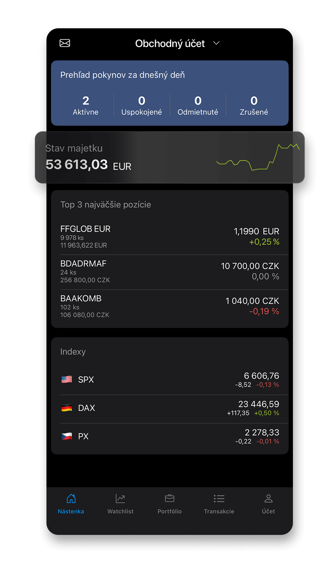 Úvodná stránka vás udrží v obraze. Vidíte prehľad pokynov za aktuálny deň, stav svojho majetku, top 3 pozície aj vývoj hlavných indexov.