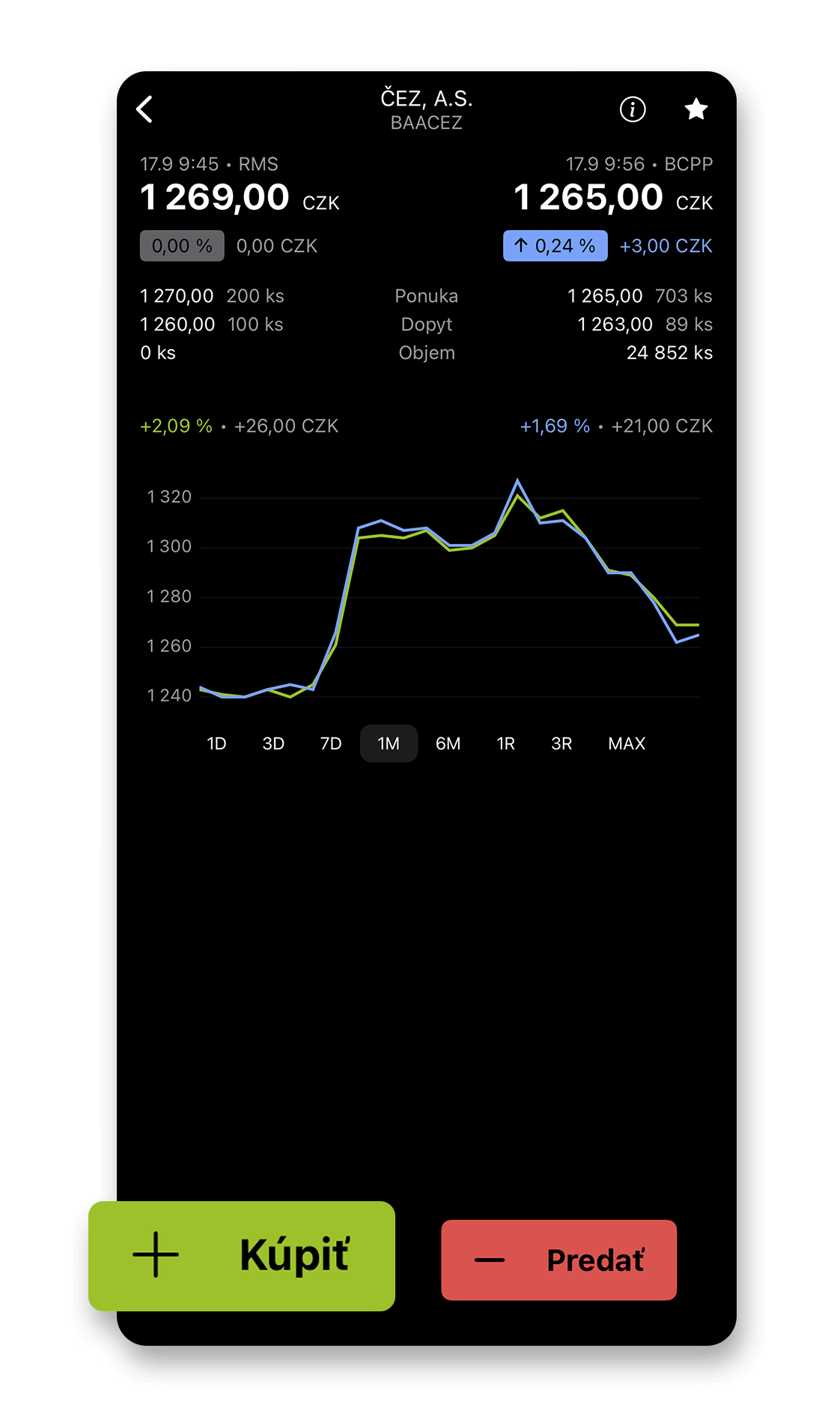 Kupovať alebo predávať cenné papiere môžete kedykoľvek jednoducho na ich detaile, a to pohodlne a rýchlo aj dlhým stlačením ponuky/dopytu na Watchliste. Na nákupnom pokyne vľavo dole vidíte svoju kúpnu silu, t. j. peniaze, ktoré máte k dispozícii. U predajného potom celkový počet kusov daného cenného papiera, ktorý máte v portfóliu.